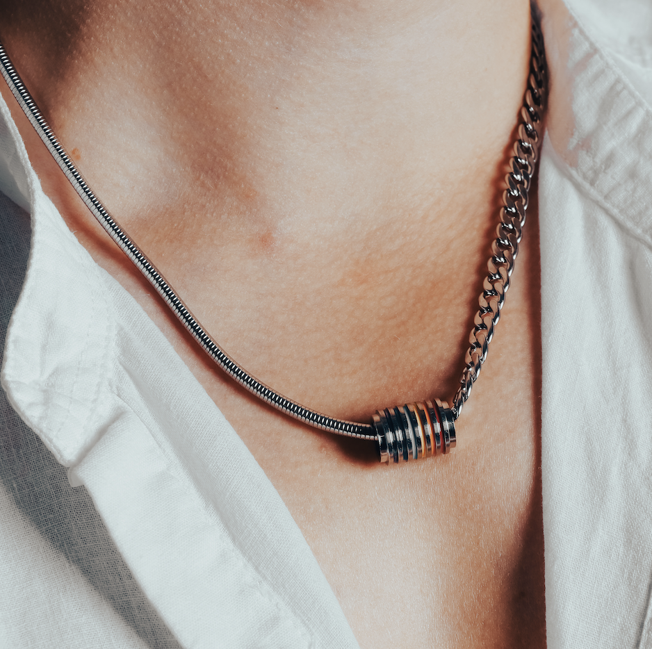 Unleash your inner power with this stunning and unique Powerful Mixed Chain with Rainbow Pendant. The beautifully crafted pendant inspirated by rainbow colors and carefully curated mixed chain were specially chosen for their ability to captivate and inspire. This accessory is truly one-of-a-kind, just like you.