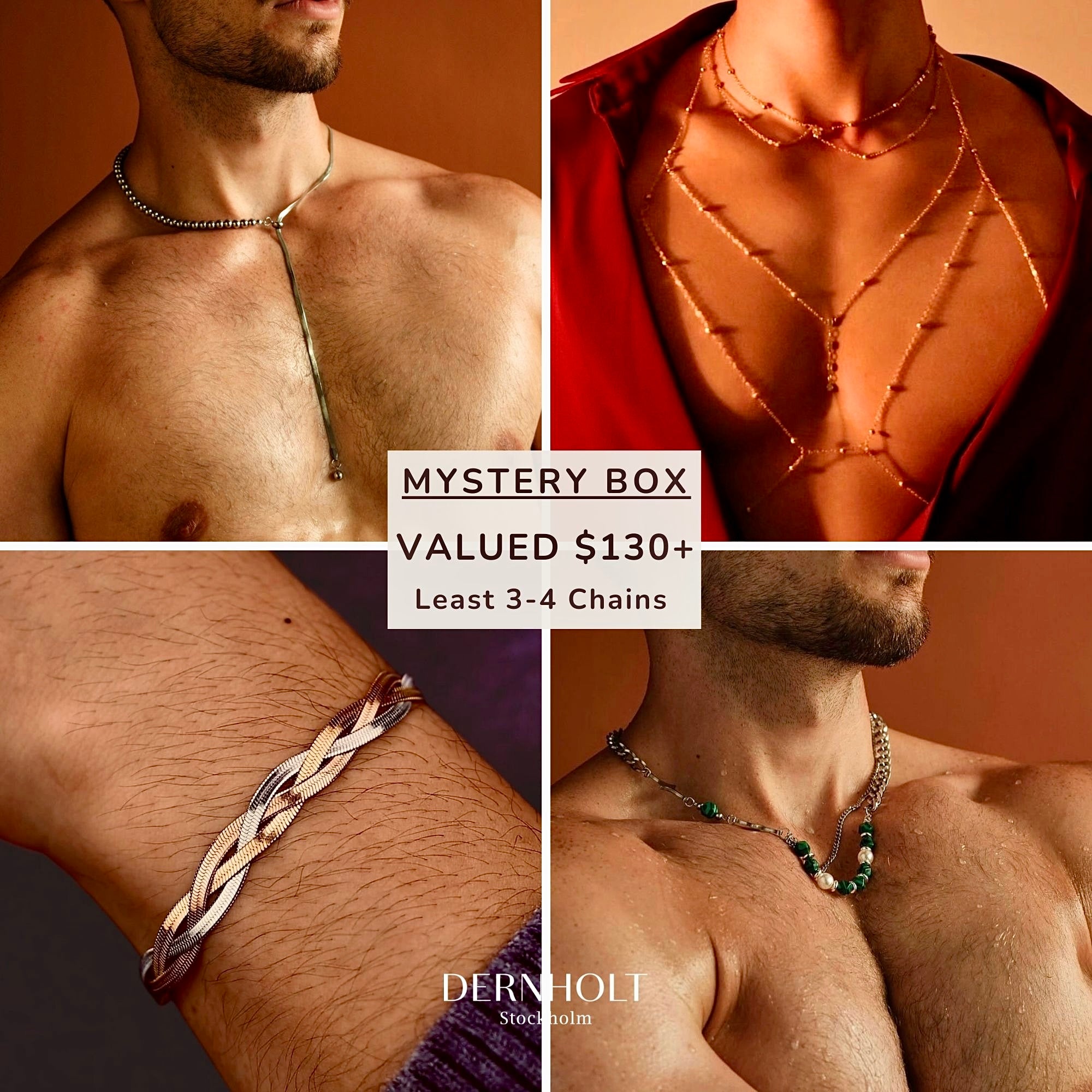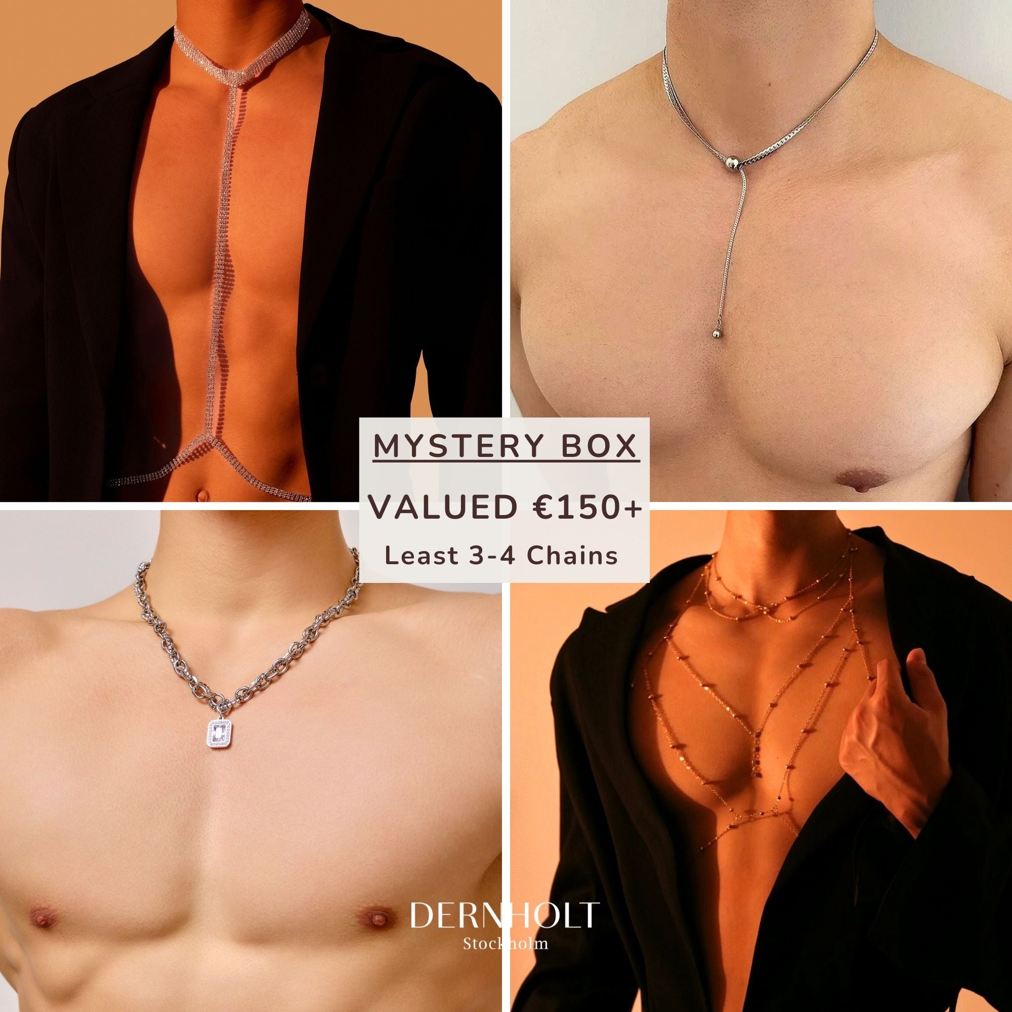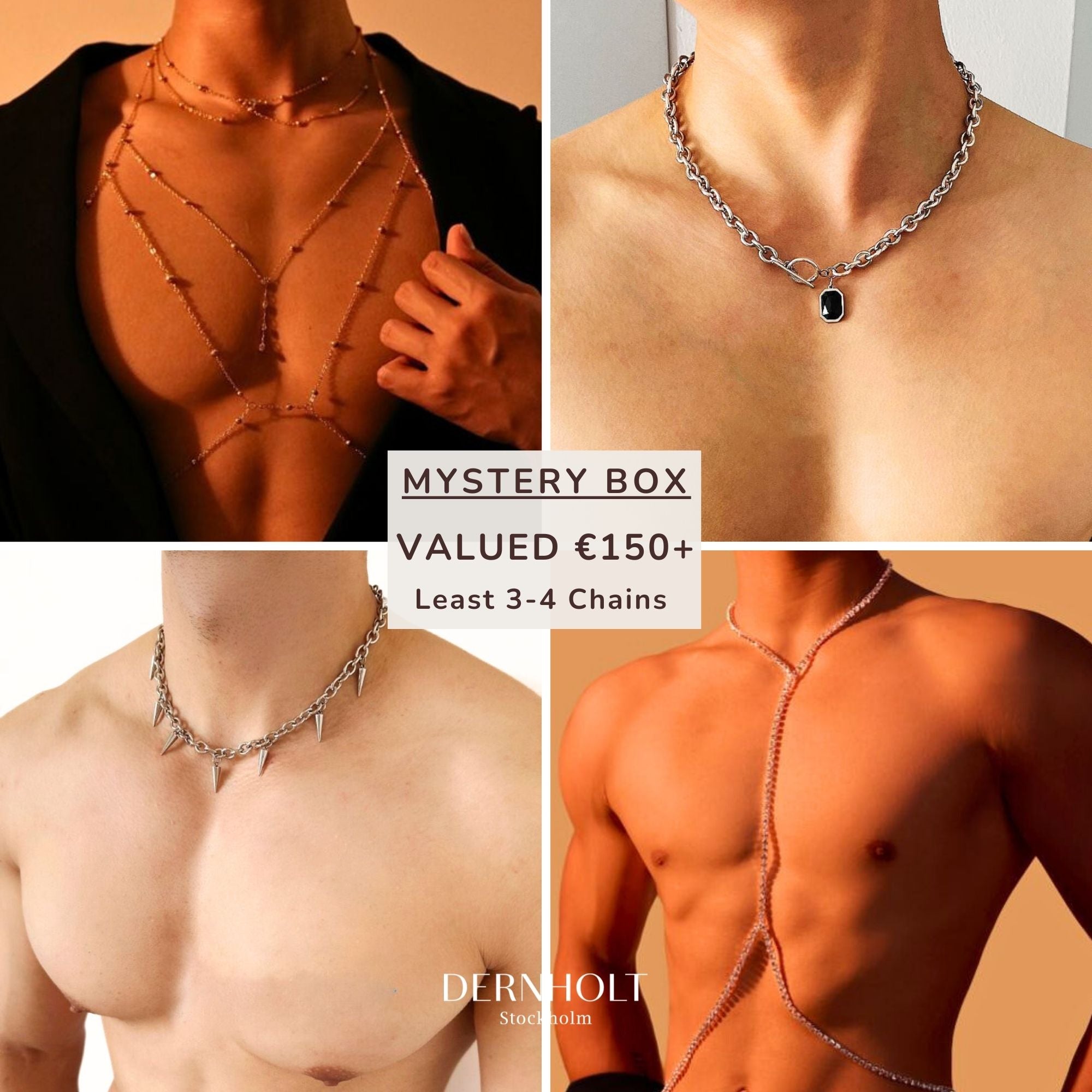 Get ready for the ultimate deal of the year - our Mystery Box in gift box packaging! Valued at over 120 €, this mystery box guarantees 4 stylish chains and body accessories. Featuring a variety of body chains and necklaces from our website, this is one offer you don't want to miss out on!