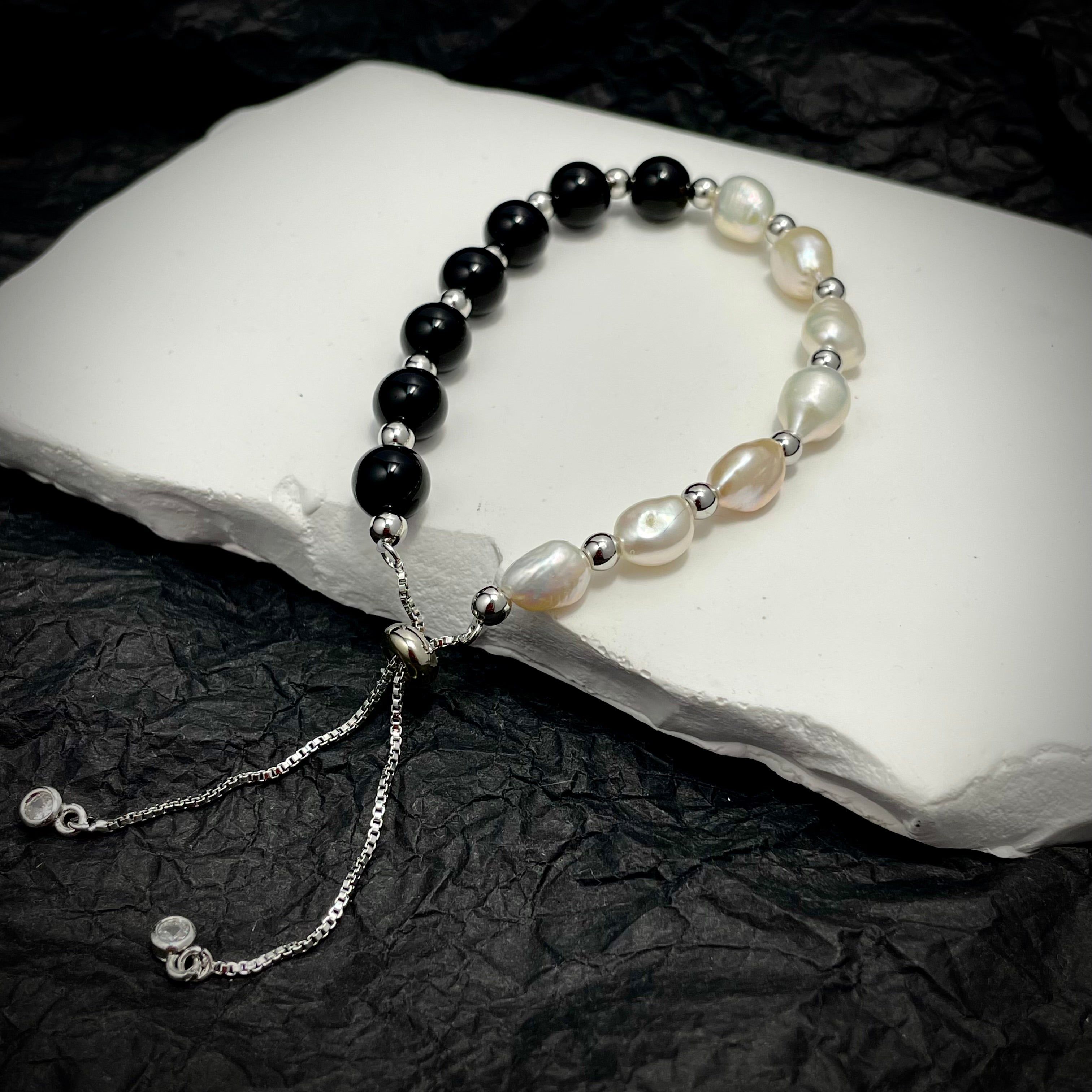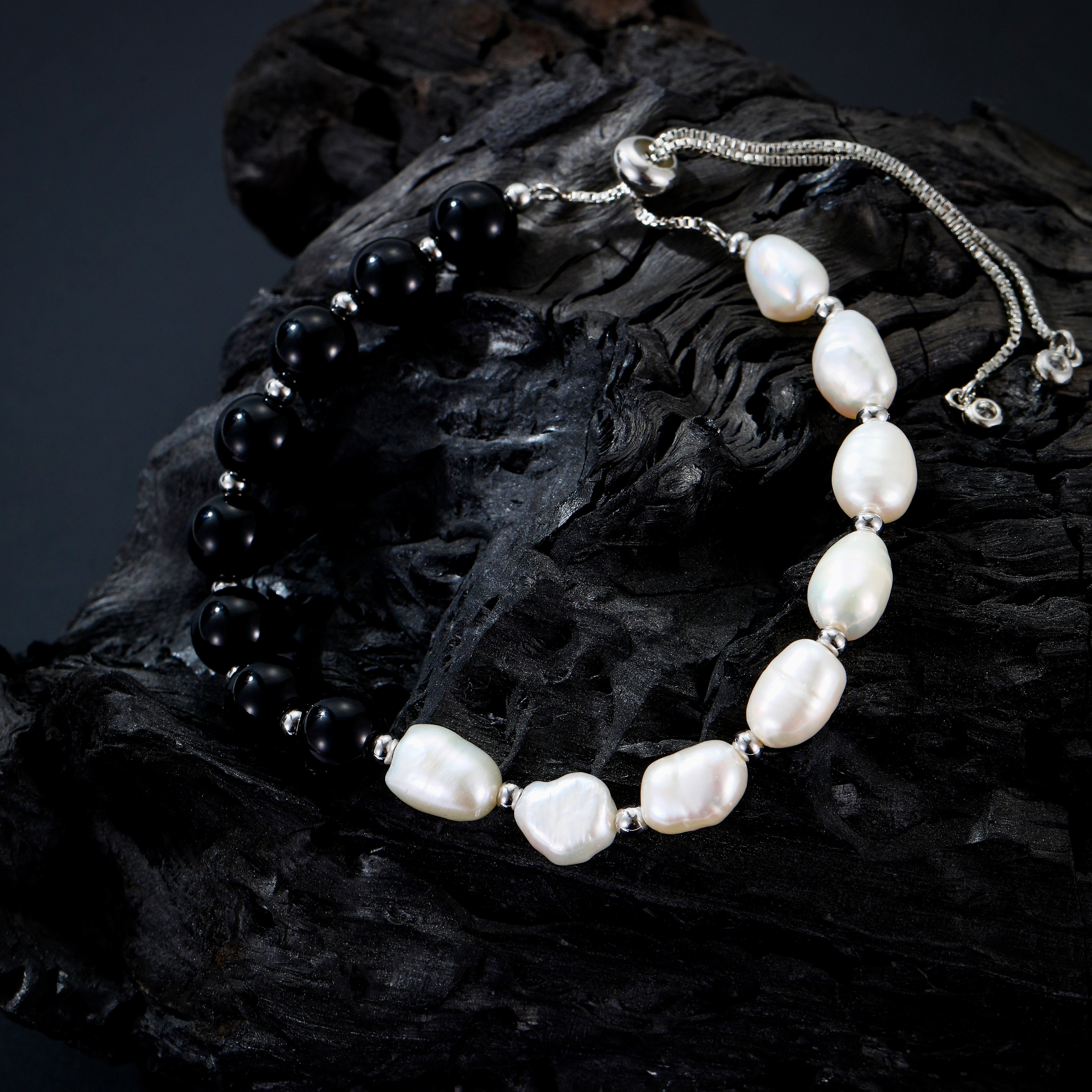 A delicate blend of natural irregular freshwater pearls and black glass beads with 14K white gold-plated materials and findings.